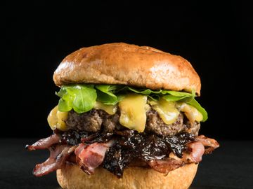 100 % Beef Patty, Gorgonzola Cheese, Smoked Bacon, Caramelised Onions, Rocket