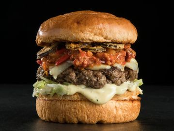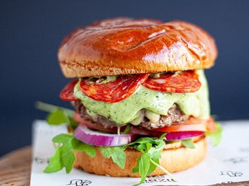 100% Beef Patty, Pepperoni, Mozzarellla, Rocket, Tomato, Basil Pistou Mayonnaise