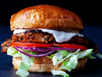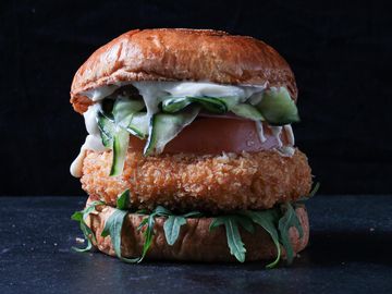 Panko Crumbed Butternut Patty, Shredded Lettuce, Pickles, Red Onion, Truffle Mayo, Sesame Bun