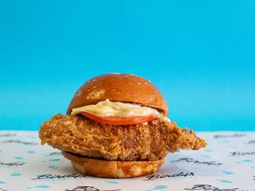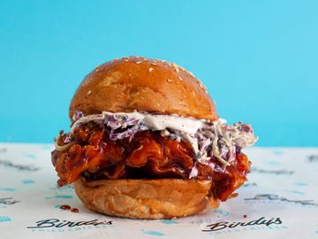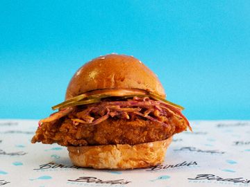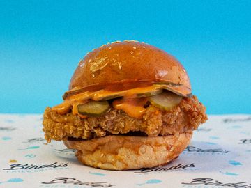 House Spiced Fried Chicken Breast, Nashville Chilli Oil, Slaw, Pickles, Spicy Mayo, Sesame Bun