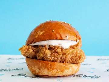 House Spiced Fried Chicken Breast, Spicy Mayo, Pickles, Sesame Bun